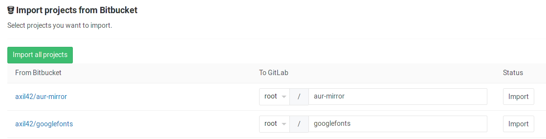 Click on the projects that you'd like to import or Import all projects. You can also select the namespace under which each project will be imported.